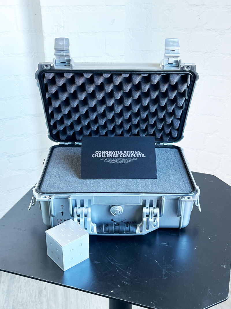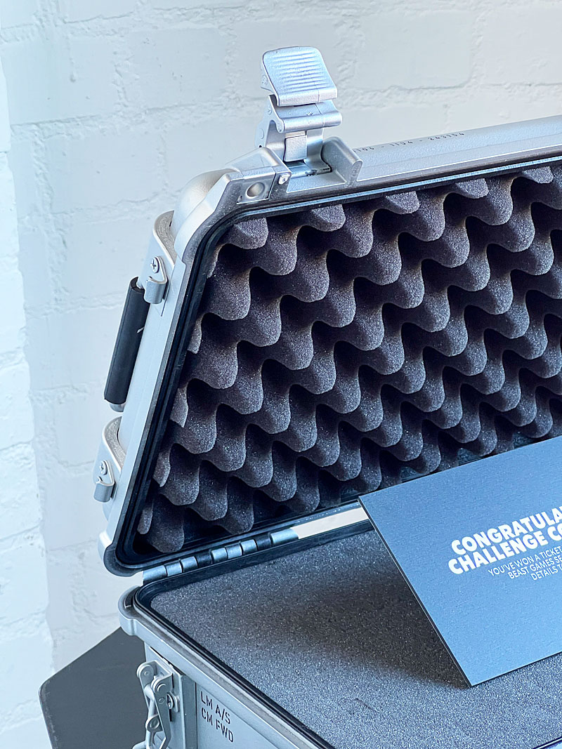 RCS Custom Exhibits fabricated five premium, luxury-style interactive puzzle cases for the Beast Games, a high-profile collaboration between MrBeast, Amazon Prime, and Starbucks. Each case was engineered to resemble a reinforced metal transport case, featuring functional locking hardware and an attached puzzle mechanism that revealed a hidden code. Once solved, recipients could unlock the case to access an exclusive Beast Games invitation, transforming a campaign deliverable into a fully immersive brand experience.